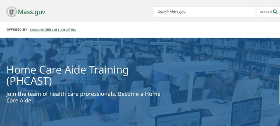 This free online course is available for providers to train individuals who want to work as Homemakers or Personal Care (PC) Homemakers, or as a refresher for specific skills for either role. This free, online training which includes self-paced modules can be taken on a laptop, tablet, or phone. Courses are available to anyone interested in learning more about becoming a Homemaker or PC Homemaker, seeking employment in the home care field, or simply looking to refresh their skills. At this time training is available in English, Spanish, and Haitian Creole here: https://mahomecaretraining.org/